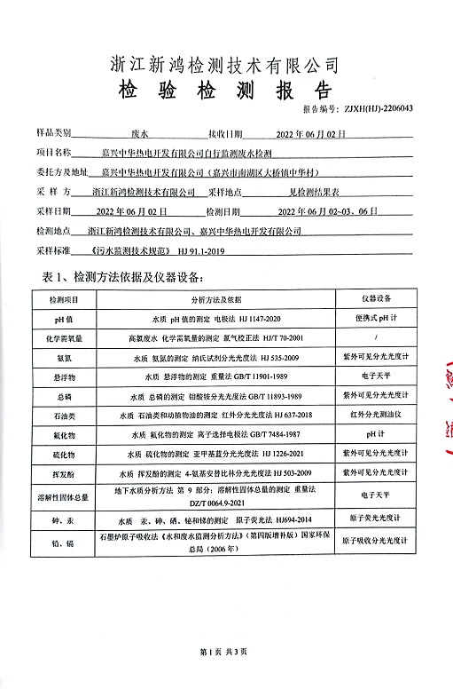 報告名稱(chēng):中華熱電2022年6月廢水檢測報告