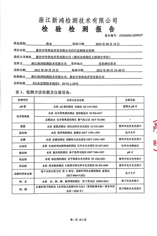 報告名稱(chēng):中華熱電2022年9月廢水檢測報告
