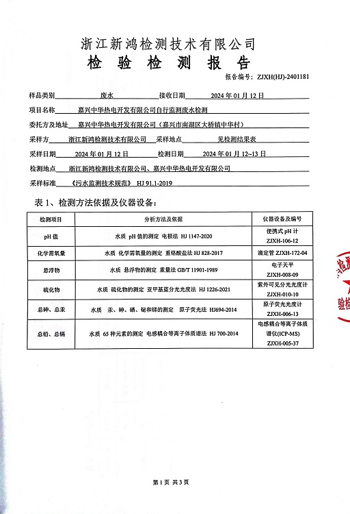報告名稱(chēng):2024年中華熱電1月廢水檢測報告