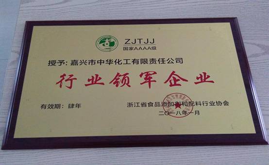 2018年1月30日,浙江省食添配行業(yè)協(xié)會(huì )第五屆第一次會(huì )員代表大會(huì )在浙江杭州中瑞大廈順利召開(kāi),我公司憑借良好的業(yè)績(jì)榮膺“行業(yè)領(lǐng)軍企業(yè)”榮譽(yù)稱(chēng)號。