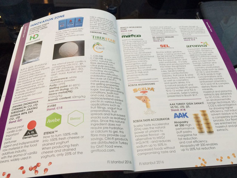 5月4~6日,公司派員參加了在伊斯坦布爾舉行土耳其食品配料展。展會(huì )期間接洽了來(lái)自土耳其、敘利亞、伊朗、埃及等國家的客商,展會(huì )會(huì )刊在醒目位置為公司免費宣傳推介久珠品牌香蘭素產(chǎn)品,進(jìn)一步擴大了公司產(chǎn)品的國際市場(chǎng)知名度。