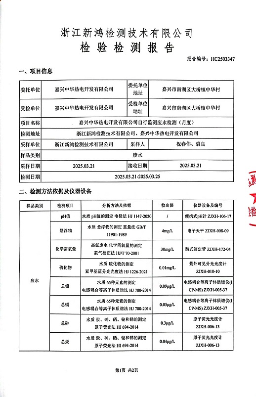 報告名稱(chēng):中華熱電3月廢水檢測報告