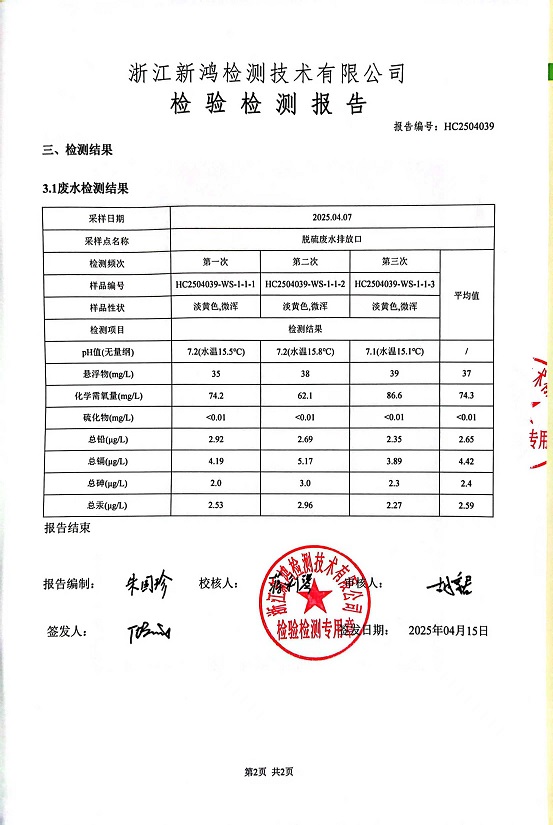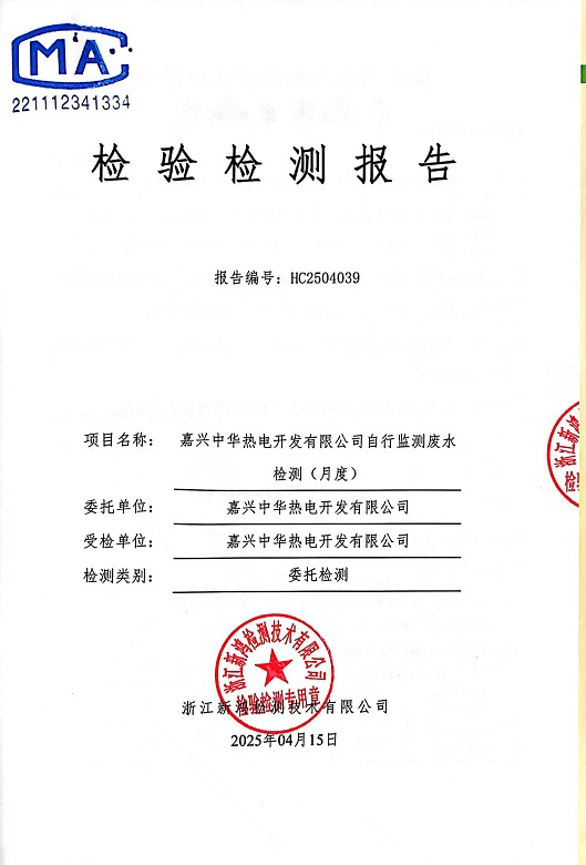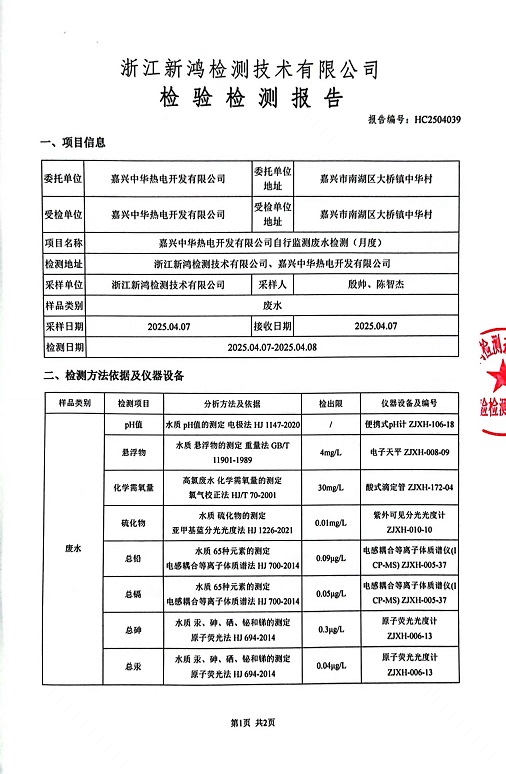 報告名稱(chēng):中華熱電4月廢水檢測報告